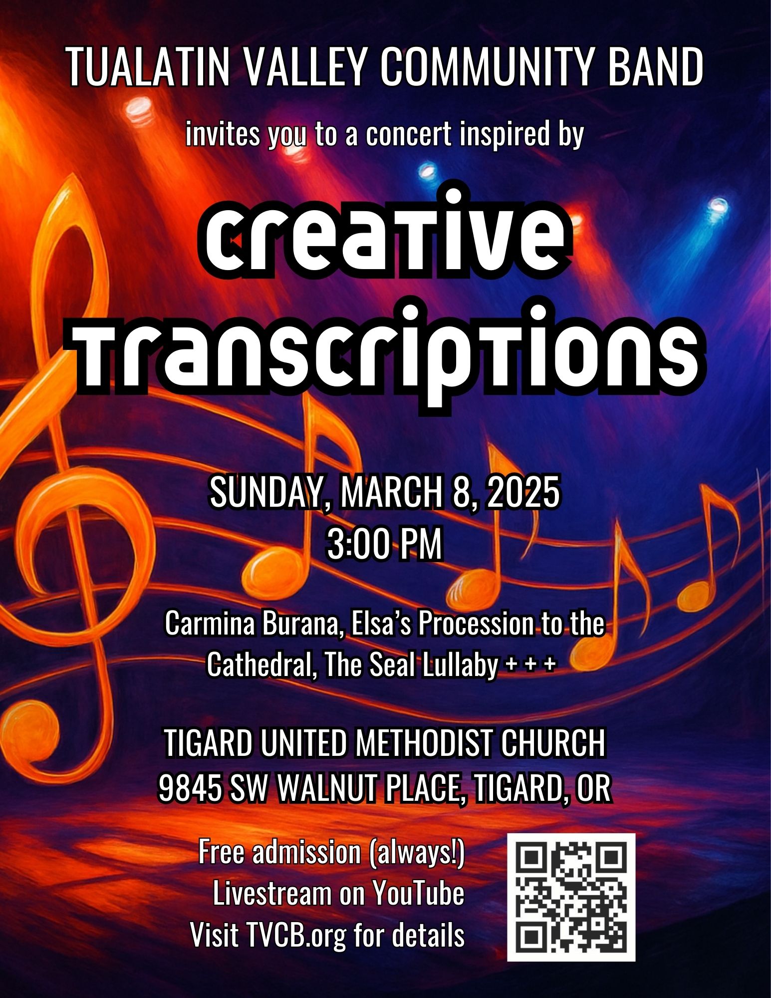 Our March 8th concert focuses on transcriptions from original orchestra, opera and choir pieces. Very few pieces were composed for concert bands and they had to be transcribed. This will be fun for all!