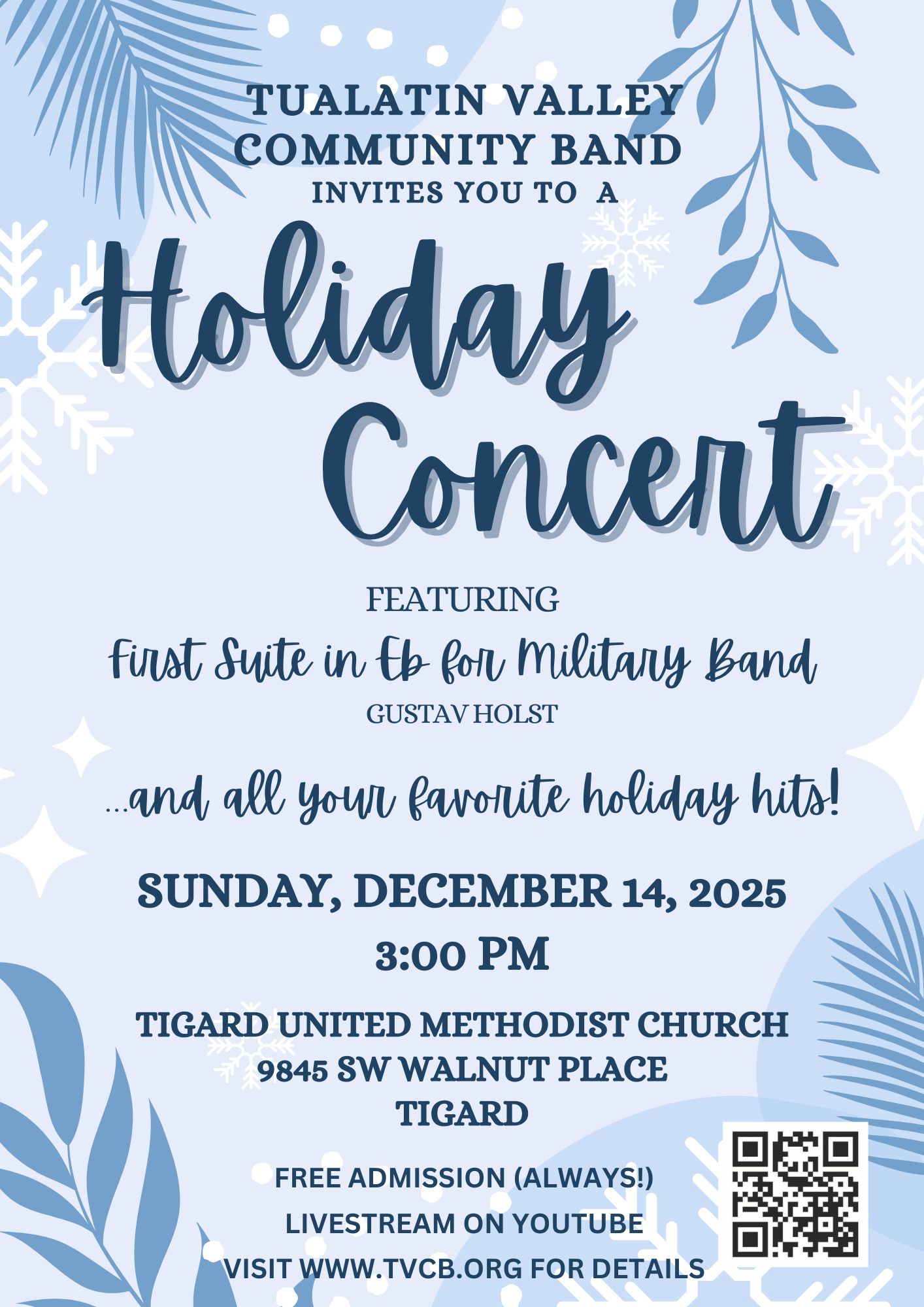 Join TVCB for our free Holiday Concert on December 14, 3pm at Tigard United Methodist Church, 9845 SW Walnut Pl, Tigard, OR 97223. If you can't attend, we will livestream the concert on YouTube at this link.